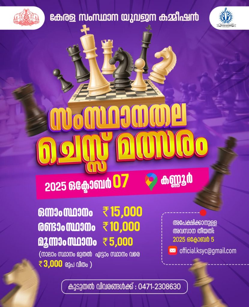 - കേരള സംസ്ഥാന യുവജന കമ്മീഷൻ സംസ്ഥാനതല ചെസ്സ് മത്സരം സംഘടിപ്പിക്കുന്നു