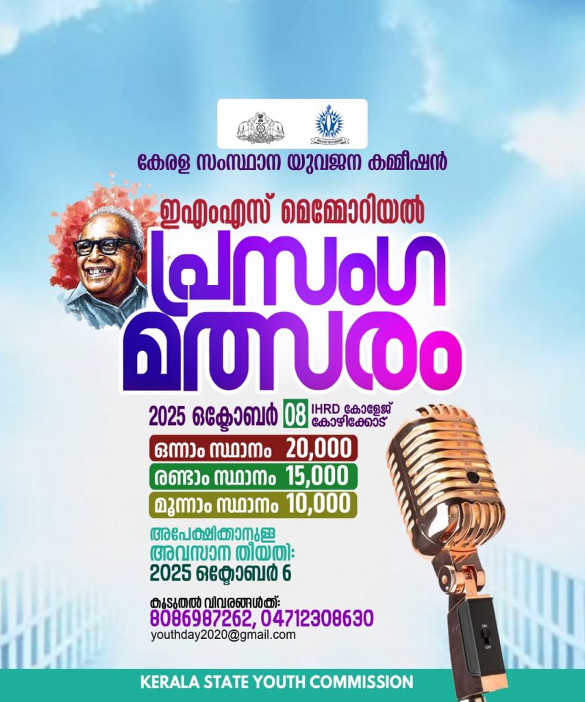 - കേരള സംസ്ഥാന യുവജന കമ്മീഷൻ – ഇ.എം.എസ് മെമ്മോറിയൽ പ്രസംഗ മത്സരത്തിന് തുടക്കമായി