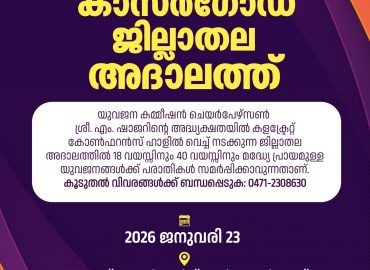 കേരള സംസ്ഥാന യുവജന കമ്മീഷൻ ചെയർപേഴ്സൺ ശ്രീ എം.ഷാജറിന്റെ അദ്ധ്യക്ഷതയിൽ 2026 ജനുവരി 23 വെള്ളിയാഴ്ച രാവിലെ 11 മണി മുതൽ കാസർഗോഡ് കളക്ട്രേറ്റ് കോൺഫറൻസ് ഹാളിൽ […]